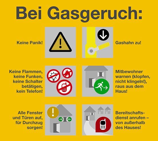 * Bei starkem Gasgeruch oder Strömungsgeräuschen muss das betroffene Gebäude geräumt werden.