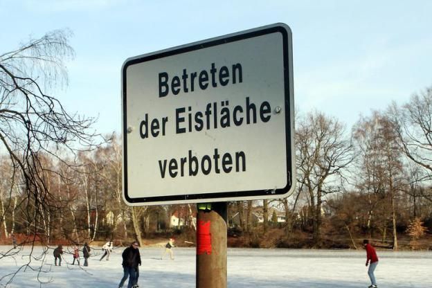 warnen wir davor, die Eisflächen zu betreten. Die dicke der Eisflächen ist zum ungefährdeten betreten und benutzen nicht ausreichend. Gerade Seen, Flüsse und Bäche beinhalten von außen nicht zu sehende Gefahren, wie Strömungen, in denen das Wasser wärmer ist. Dies führt dazu, dass die Eisschicht am Rand zwar einen stabilen Eindruck macht, aber schon ein paar Zentimeter weiter nur noch wenige Millimeter stark sein kann.